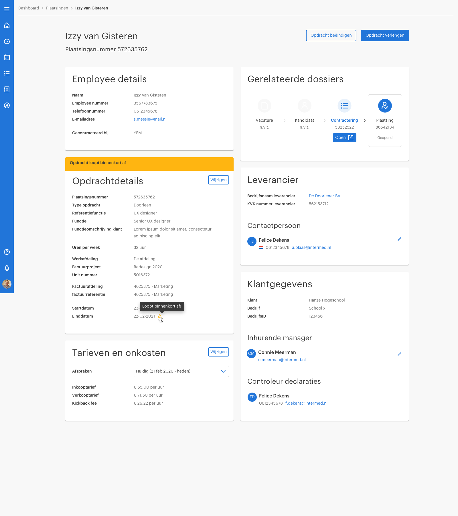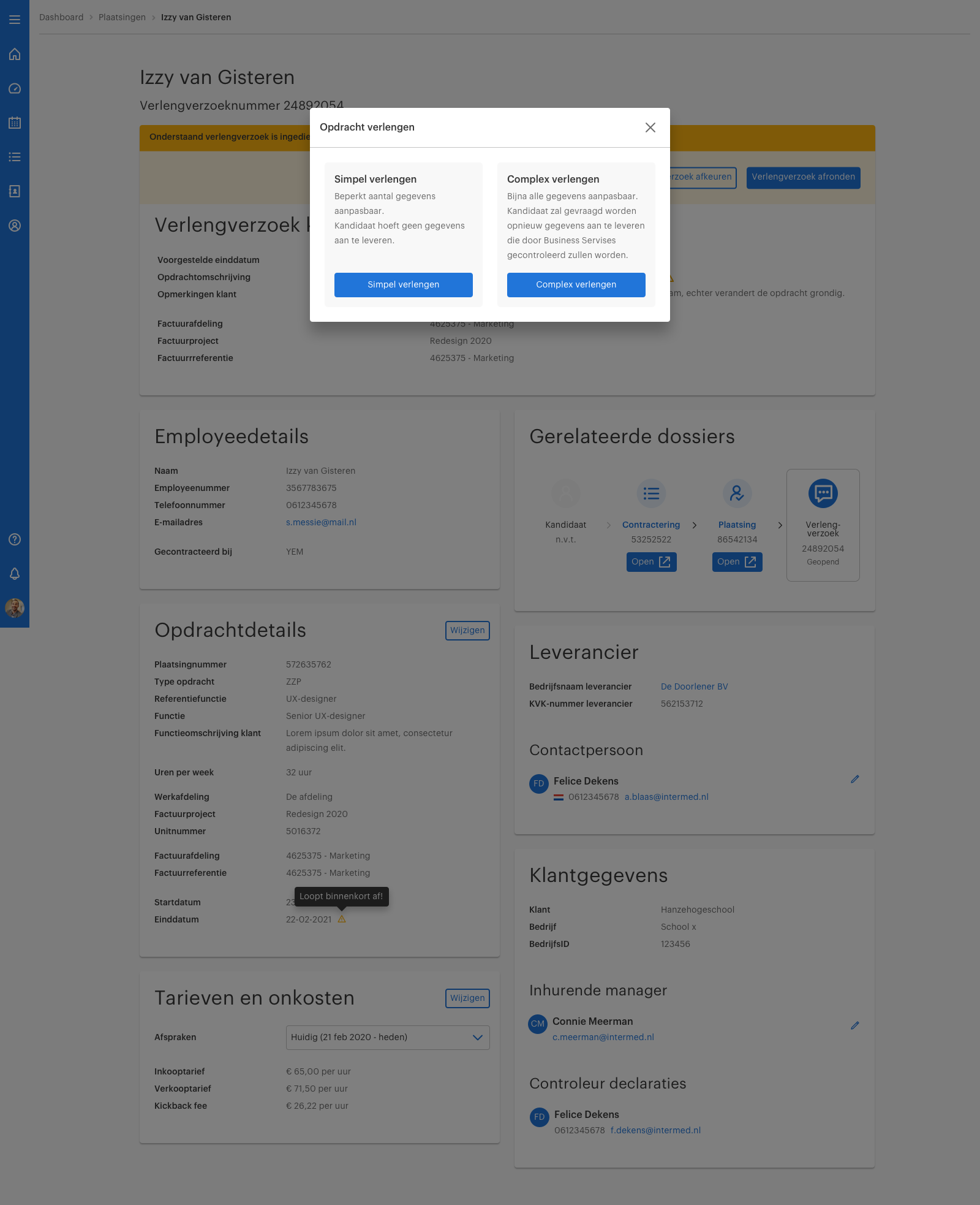 I started by designing a detailed prototype that mapped out the full user flow of the most crucial functionalities. In doing so, I carefully weighed which components from the design library could be used and where custom components were necessary for complex views, such as when screening job descriptions (approving, rejecting, and editing) and proposing candidates to clients. I also optimized and incorporated the flows for request insights, candidate details, and contract extensions into the prototype.